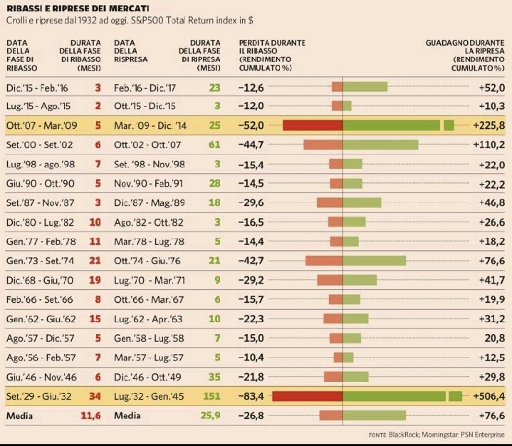 Questa tabella, ripresa dal Sole 24 Ore, fornisce una bella rappresentazione di 100 anni… Perdite massime e massimi Guadagni… dello S&P 500, della famosa crisi del ’29. Anche se non vi è certezza che quanto sia successo in passato riaccada in futuro…credo valga la pena di rifletterci.